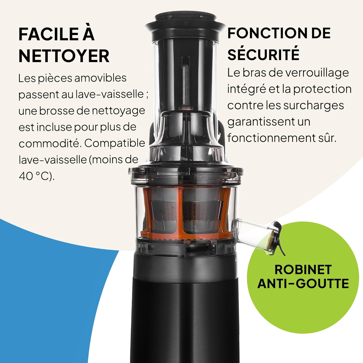– Inclus : filtre à jus, filtre à pulpe, récipient à pulpe, récipient à jus et brosse de nettoyage