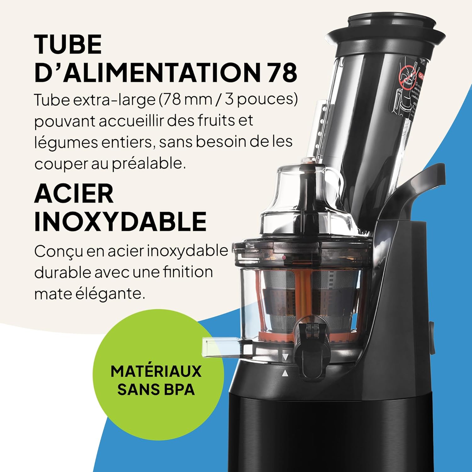 UPDATED DESIGN – Powerful 240W stainless steel matt black easy to clean metal with large 75mm tilting feed tube for NO waste Easy to assemble, use and clean, 100% safe BPA-free parts make cleaning easy. Runs quietly – less than 60 decibels. Sturdy stainless steel and sturdy and stable body ensure you a calm and calm environment when extracting and an amazing look in your kitchen.